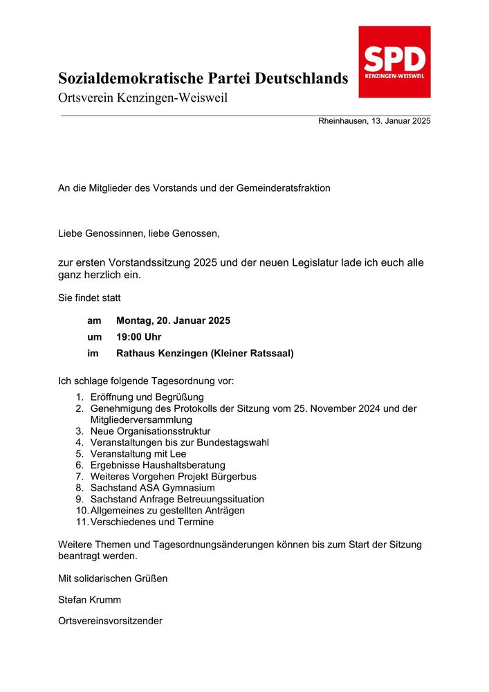 Einladung zur parteiöffentlichen Vorstandssitzung